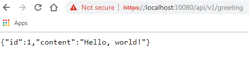 Once started, you can try the api/v1/greeting API from your browser to get some “Hello, world!” JSON: