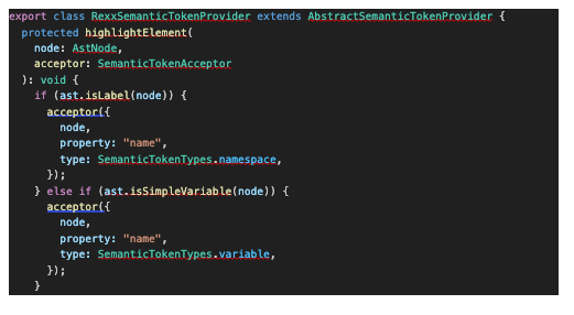 Langium provides a mechanism for syntax highlighting through semantic tokens. I created a custom semantic token provider that analyzes the Rexx abstract syntax tree (AST) and applies appropriate token types.