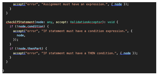Langium has a validation framework which traverses the AST to ensure the Rexx input files are correct. I created basic validations which check missing expressions in assignments and incomplete if statements.