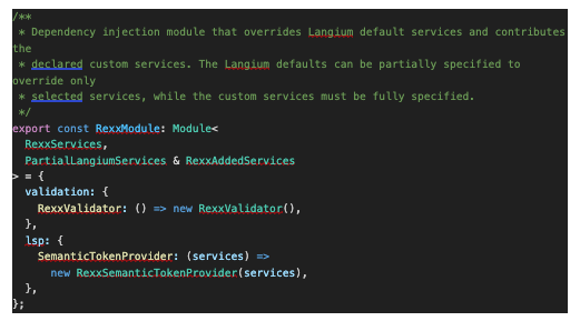 A key part of integrating the Rexx language services was setting up the dependency injection module, which connects the custom validators and syntax highlighters to Langium’s language server framework.